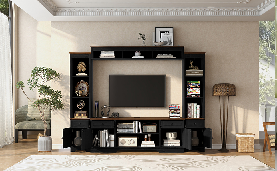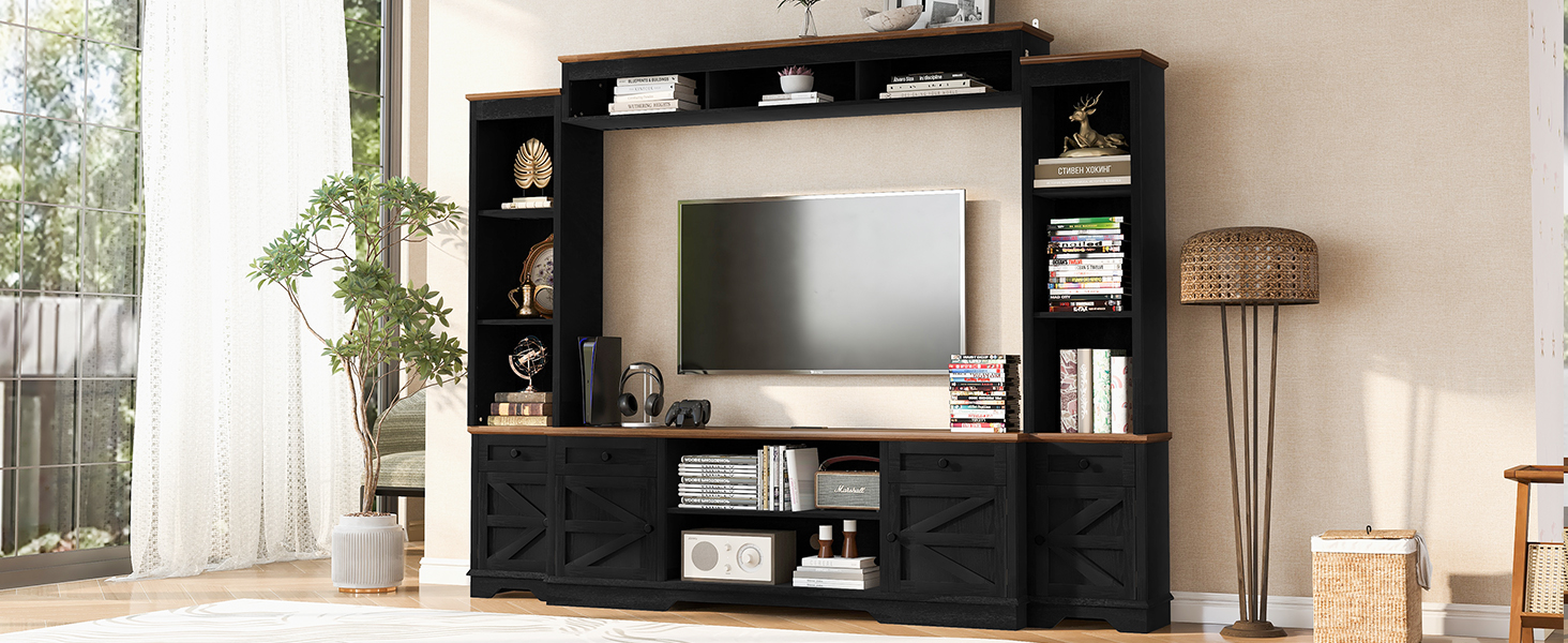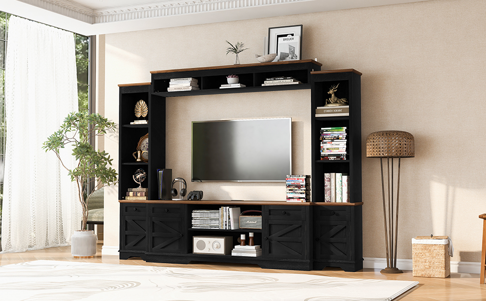 • 4 barn doors, 4 drawers, 9 open compartments, it offers ample storage for entertaining necessities.Equipped with 2 outlets, 1 USB port,1 Type-C port, this TV stand ensures seamless connection for TVs, gaming consoles and smart devices.